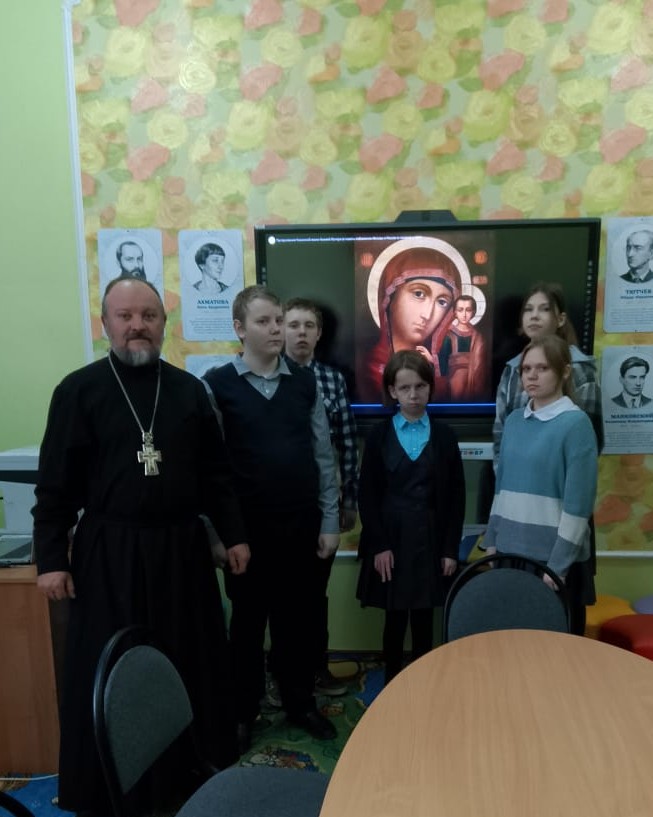 В завершение занятия ребята пообщались с батюшкой, задали ему интересующие вопросы о вере, молитве и истории праздника Казанской иконы Божией Матери, с которым связано установление Дня народного единства — праздника, объединяющего всех россиян.