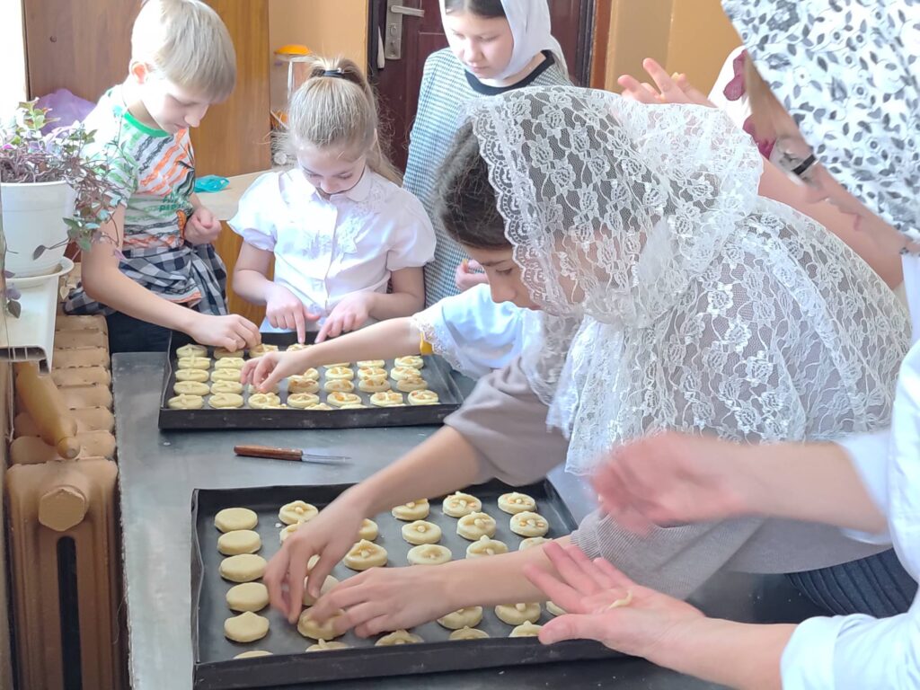 Затем детей ожидало особое и радостное занятие — участие в приготовлении постного печенья с изображением креста. В христианской традиции существует благочестивый обычай на Крестопоклонной неделе печь печенье с изображением креста как напоминание о поклонении Честному и Животворящему Кресту Господню.